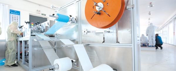 经理宋景峰告诉记者,这个车间从落成到生产仅用了15天时间,这段时间有4条生产线在24小时不间断地生产。他们在抓紧生产的同时,还在建设无菌车间。无菌车间落成后,将有6条生产线同时工作,全负荷生产可达到日产6至8万个口罩。