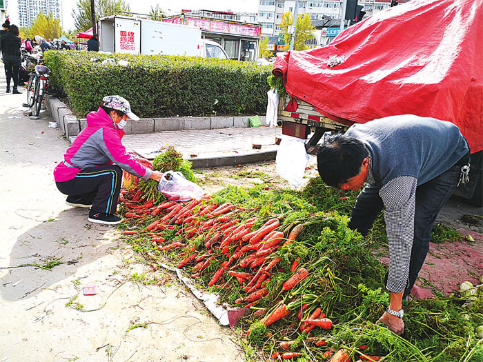 记者看到,在赵永春经营的土豆堆旁边,市民们逐个挑选着,手里拿的都是塑料袋和小编织袋。