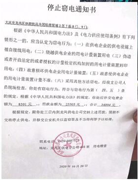 被怀疑“窃电”后,龙凤区供电公司的工作人员下达了通知:三日内到龙凤区供电公司交纳罚款,预期不交将停止供电。