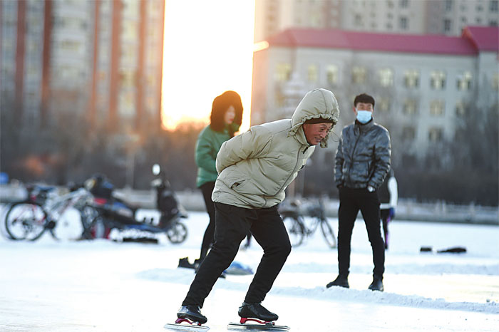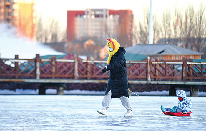 开阔的冰冻湖面,是一个天然的冰上游乐场。在已经封冻的新潮湖和黎明湖上,都可见到三三两两的冰上运动爱好者。黎明湖上,市民刘先生告诉记者,黎明湖现在的冰层已经很厚,在上面滑冰完全没有问题,他们几个冰友还自发地清扫维护冰面,这样滑起来更安全、更畅快。不远处,有个小朋友坐在雪橇上,让家长拉着在冰面上快速滑行,孩子欢快的笑声洒满湖面。