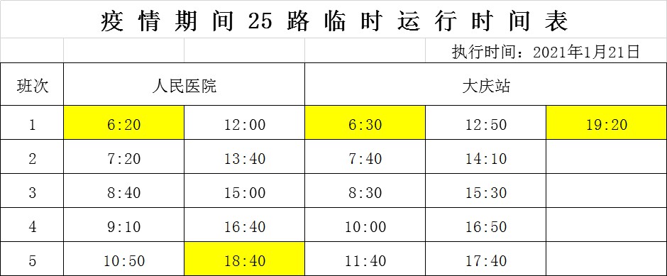 25路减少11车次,人民医院首班调整为6:20分、末班18:40分、大庆公交总站首班调整为6:30分、末班19:20分;