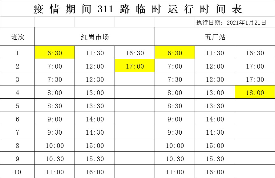 311路减少3台班34车次,红岗市场、五厂首班调整为6:30分,末班红岗市场站调整为17:00分,五厂末班调整为18:00分。