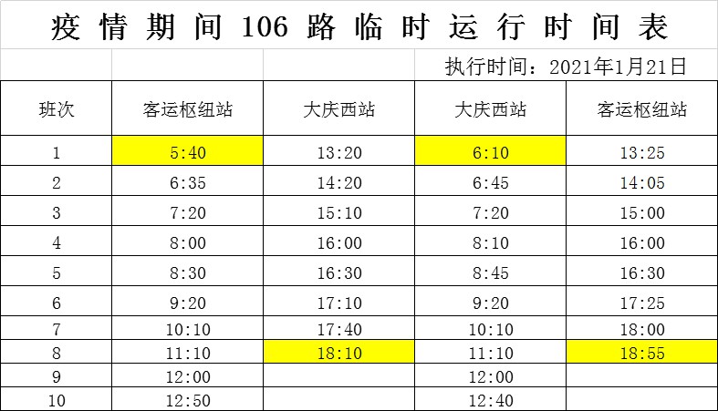 106路减少3台班18车次,大庆西站首班调整为6:10分、末班调整为18:55分、大庆客运枢纽站末班调整为18:10分;