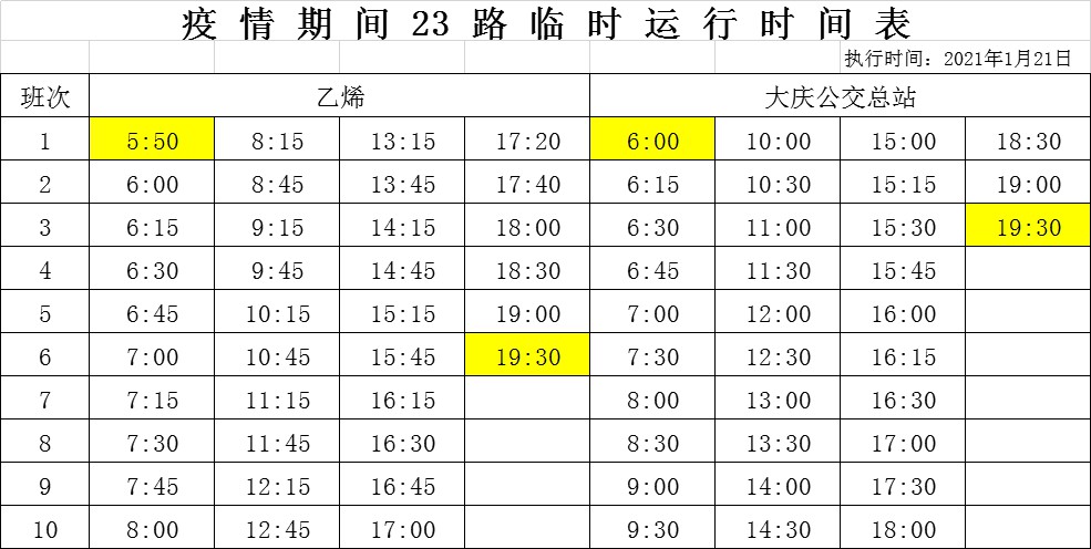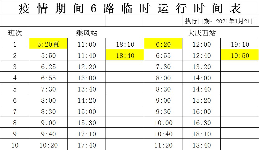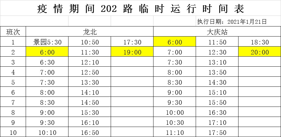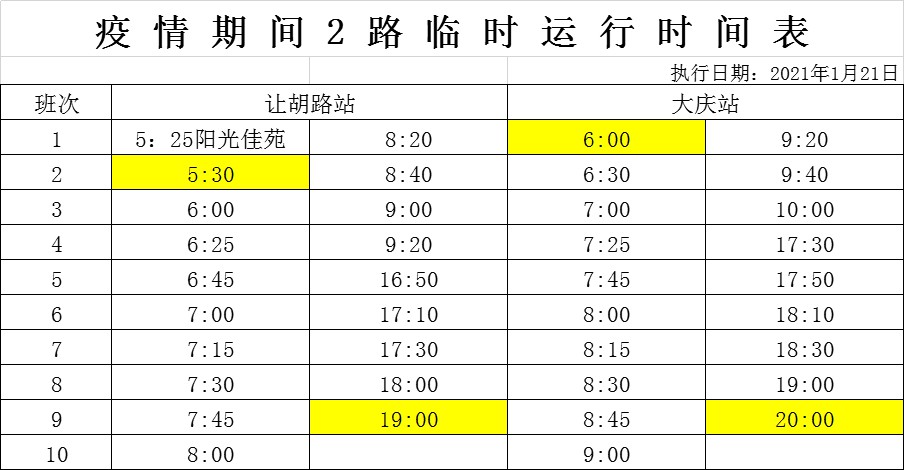 2路减少12车次,末班让胡路站调整为19:00分、大庆公交总站调整为20:00分;