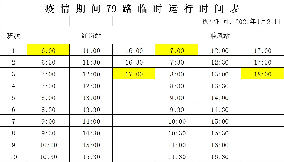 79路减少2台班14车次,红岗站首班调整为6:00分、乘风站首班调整为7:00分;